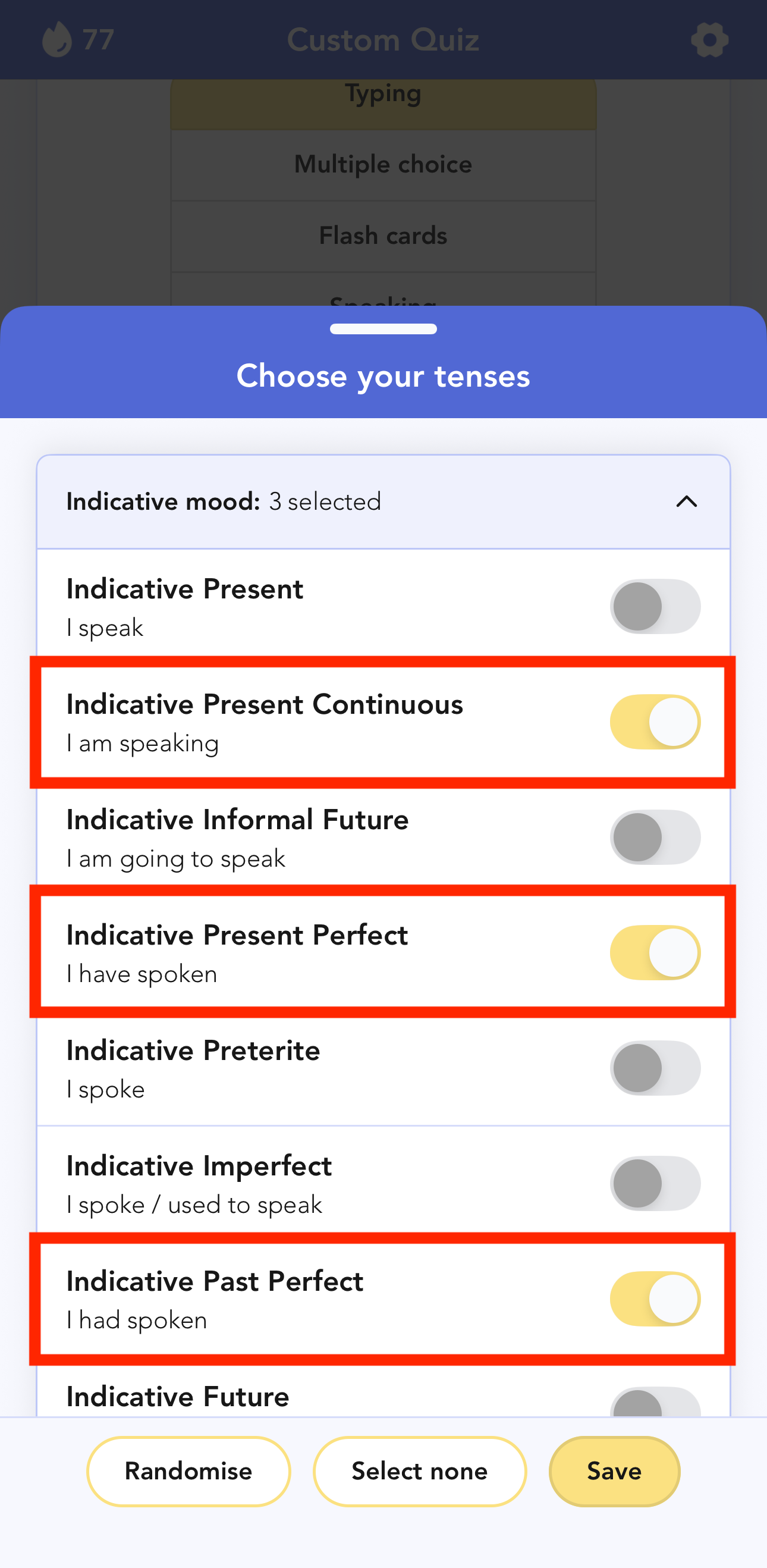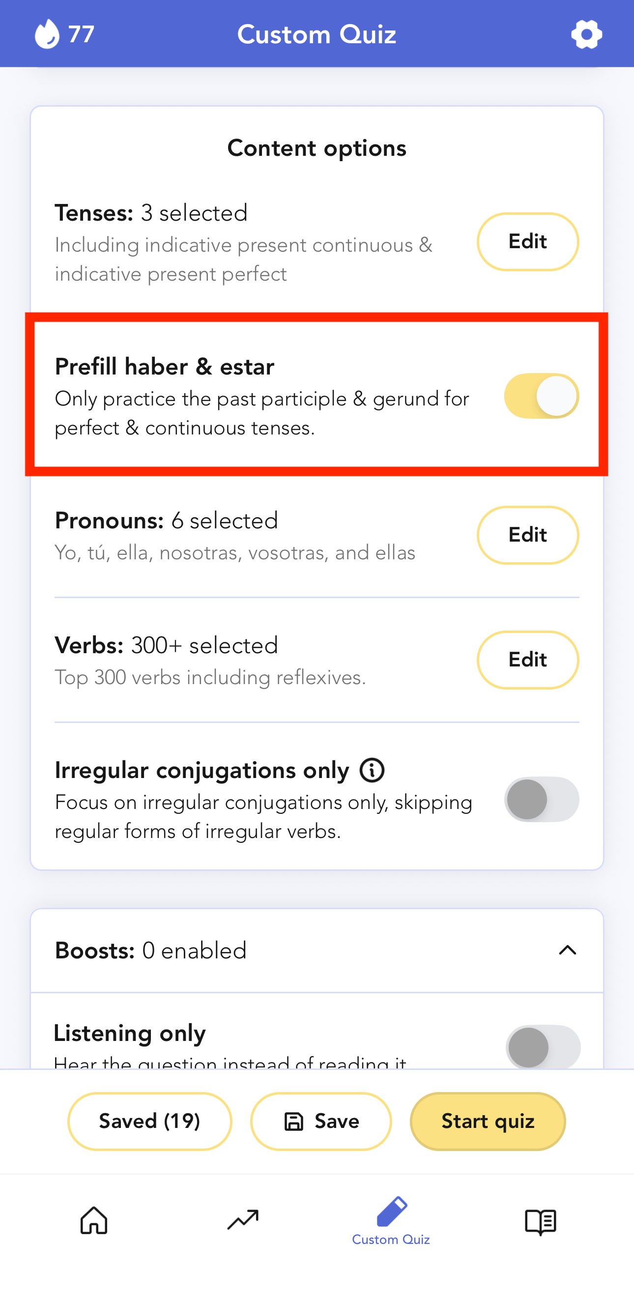 After saving your tense selections, scroll down to the "Content options" heading. There should now be an option to "Prefill haber & estar". With this enabled, the app will automatically fill in the auxiliary verb (like estoy or he) for you. This allows you to focus on typing the correct gerund or past participle.
