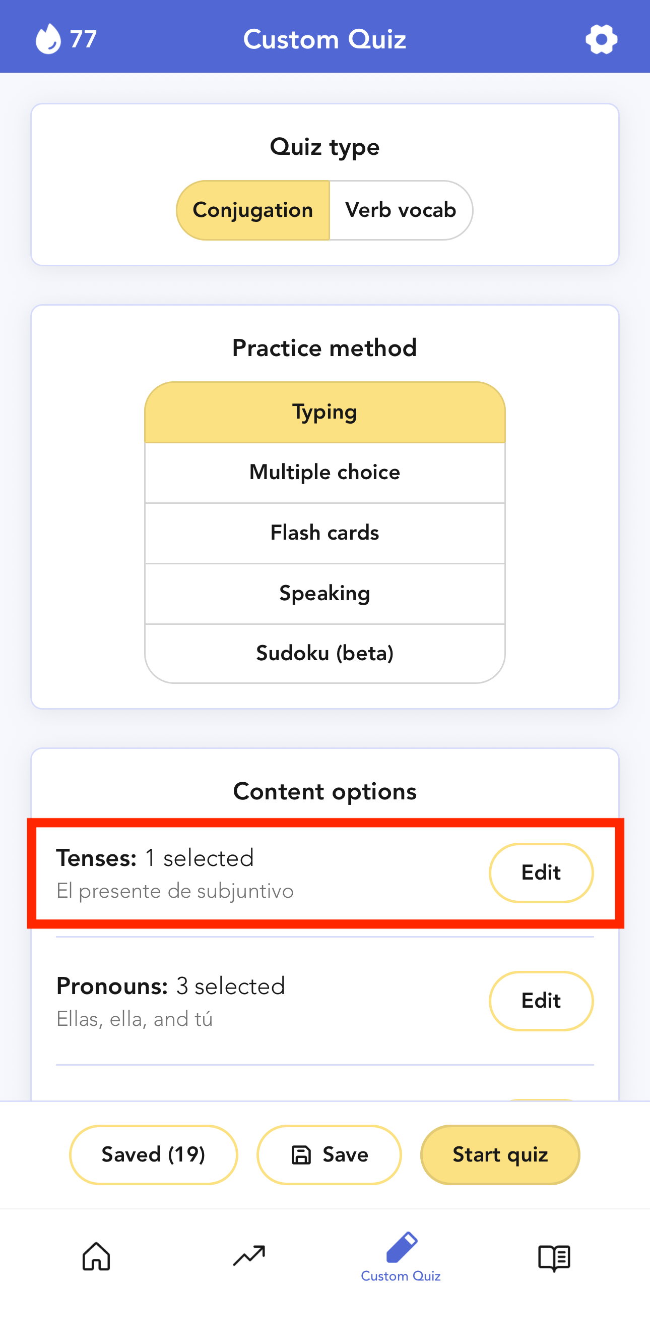 For example, to choose specific tenses, head to "Content options" and tap "Edit" next to "Tenses":