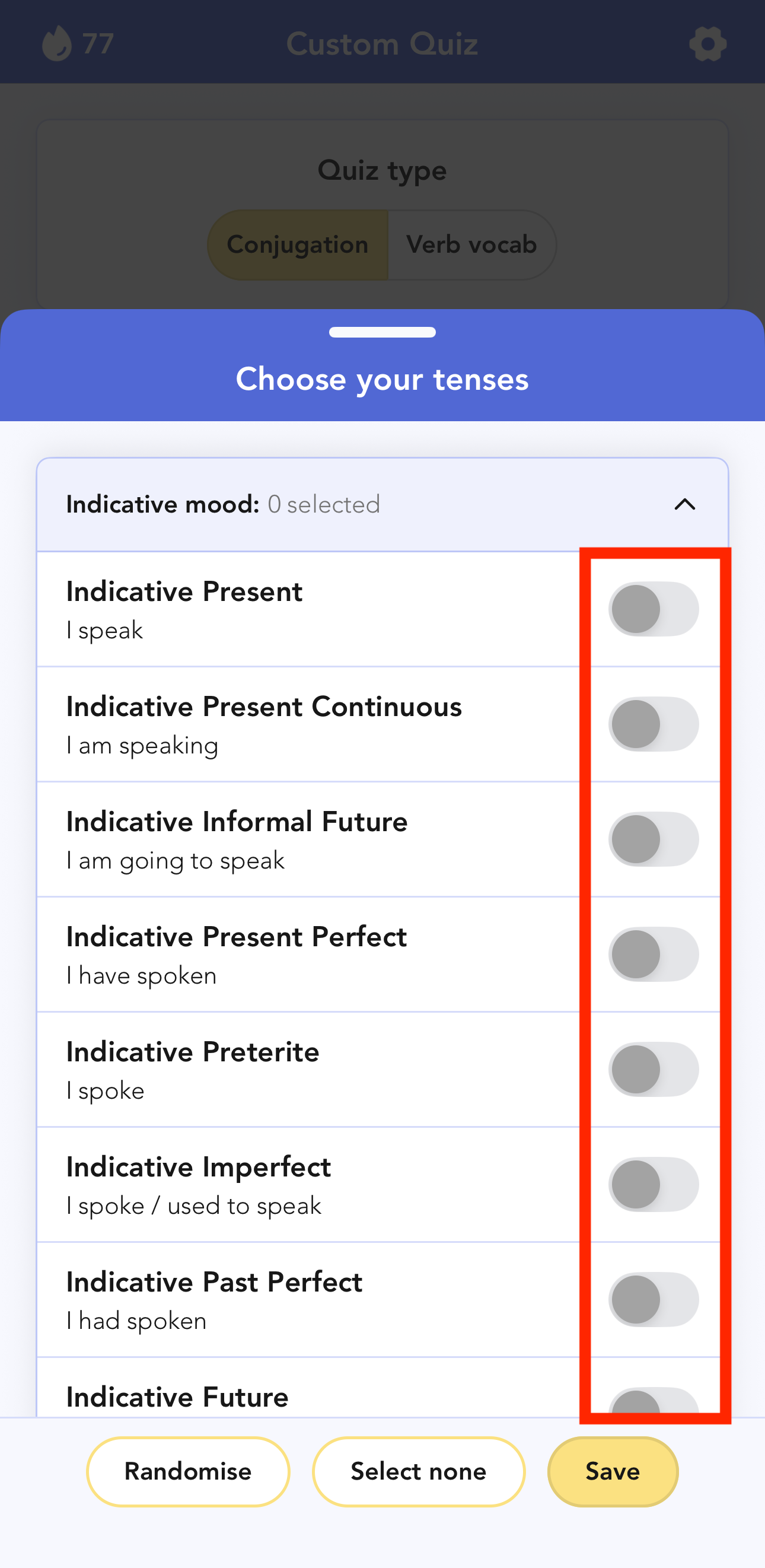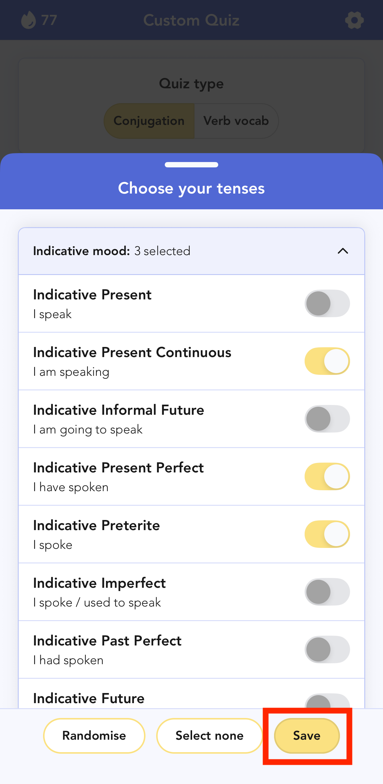 Select the tenses you want to include by tapping the buttons next to them. When a tense is selected, the button will turn yellow:
