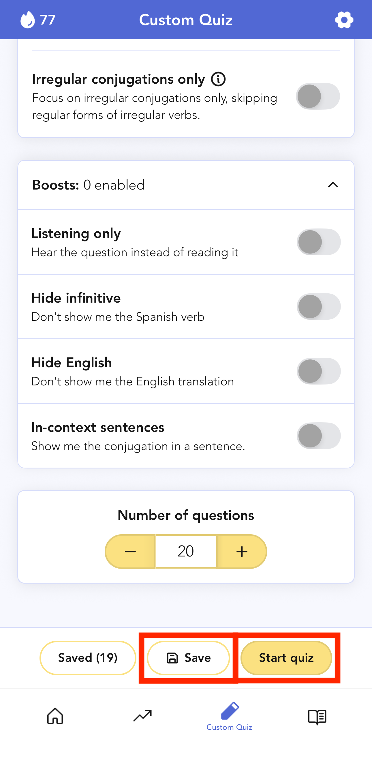 You can choose different types, methods, tenses, verbs, pronouns and specific "boosts" to make a quiz easier or harder.