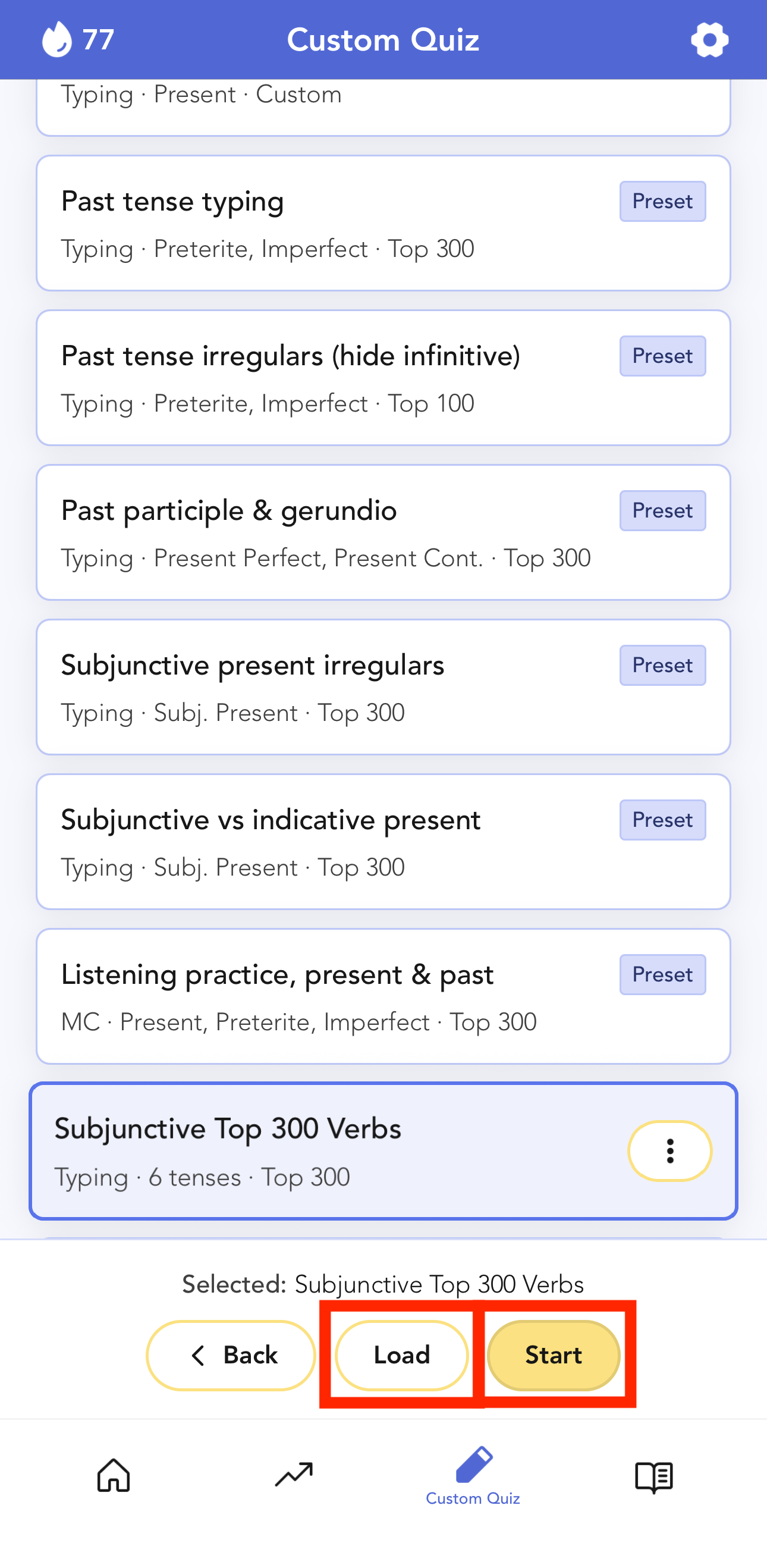 Your quiz is now in the "Saved" list, alongside several preset quizzes. Tap "Start" to quiz immediately, or select "Load" to review and adjust your filters before starting. On the web version, your saved quizzes are located on the left side of the Custom Quiz area.
